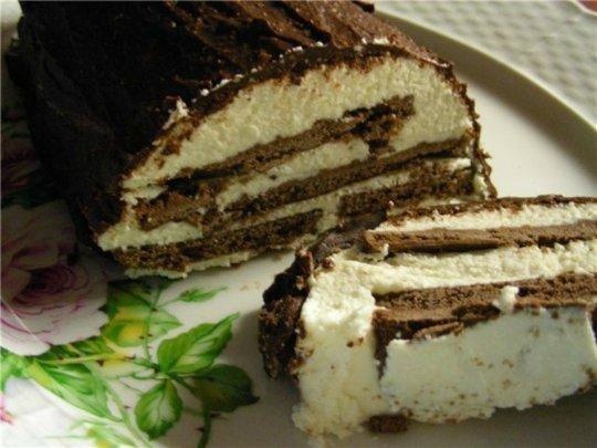 На дно формы выкладывайте слой из шоколадного печенья. Затем сладкой смесью из сметаны с творогом. Далее еще один слой печенья и т.д. до полного заполнения формы.