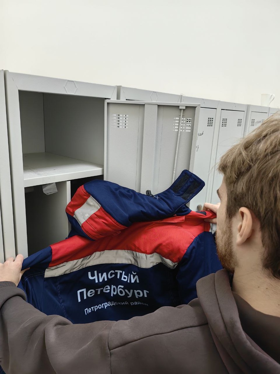 Мой рабочий день по традиции начался в 7:00 в обновлённой дворницкой на улице Ленина. Мастер участка Сергей Аракбинов провёл небольшую экскурсию и показал просторную столовую с кухней, душевые, стиральную машинку, сушильные шкафчики – всё самое необходимое для восполнения сил и подготовки к борьбе со стихией. Далее я облачился в тёплую форму «Чистого Петербурга» – отдельно отмечу продуманную деталь в виде непромокаемых варежек, в которых очень удобно работать под снегопадом, – и вышел на участок.
