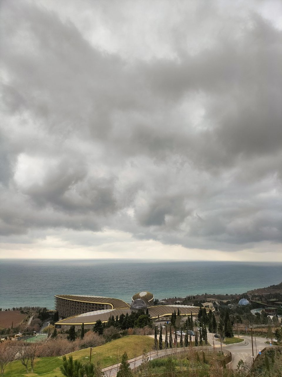 Крым это конечно место для круглогодичного отдыха и погода позволяет даже зимой выезжать в поездки, на экскурсии и т.п. Загорать не получится, а вот погулять и посетить достопримечательности всегда можно. Проехали после нового года по ЮБК в районе Большой Ялты. Покажу наши погодные контрасты и что посещают отдыхающие и местные в Крыму. Два солнечных дня после нового года сменились ветренной и облачной погодой, похолодало до +7-9. Больше ощущается холод из-за довольно прохладного ветра. Вот такие облака над морем в Крыму - Если посмотреть на горы, то все меняется очень быстро. Сначала затягивает облаками, потом они сверкают на солнце - И вот через минуту уже тучи рассеялись и вышло солнце - Новая смотровая площадка на трассе в Ялту над отелем Мрия. Кстати сделали её именно за средства гостиничного комплекса. Можно остановиться, перекусить со всеми удобствами и полюбоваться на море и горы. В новогодние праздники все украшено и создает отличное настроение - Работают все экскурсионные марш