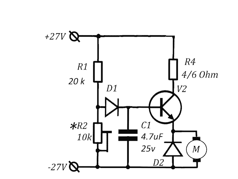 Это обычный эмиттерный повторитель. Резисторы R1,R2 задают напряжение на базе V2 и задают скорость врашения холостого хода. Конденсатор С1 предотвращает резкие рывки двигателя. Диод D1 не дает конденсатору разряжаться через достаточно малое сопротивление R2. Без него емкость конденсатора придется увеличить на порядок. Диод D2 предотвращает выбросы самоиндукции и защищает V2. при малой мощности двигателя не обязателен. Резистор R4 токоизмерительный, о нем дальше.