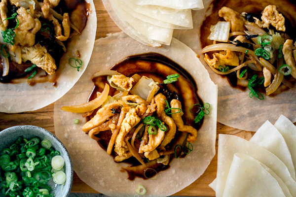 Му Шу с курицей лучше всего подавать с горячими блинчиками или рисом. Для подачи: