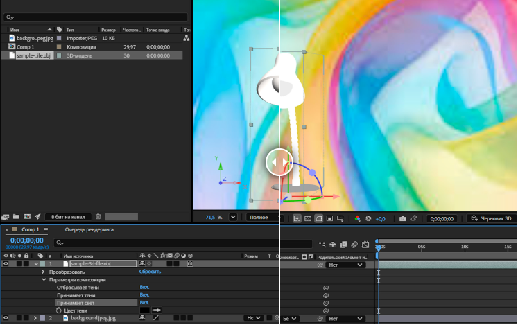При отключении параметра Принимает свет на 3D-слое в 3D-композиции на слой больше не влияют никакие источники света в сцене. Это гарантирует, что слой сохранит свой исходный вид, не подвергаясь влиянию изменений освещения, теней или бликов от других источников света. Отключение параметра Принимает свет может быть особенно полезно при работе с 3D-композицией, которая включает в себя самосветящиеся 3D-объекты, такие как экраны телефонов и неоновые огни. При импорте 3D-моделей GLB и OBJ на панель Проект и выборе одной из них над списком файлов проекта на той же панели появляется миниатюра предварительного просмотра модели. Это позволяет быстро идентифицировать и дифференцировать импортированные 3D-модели, что может способствовать более эффективному и организованному технологическому процессу. Обновление Cinema 4D 2025 представляет ряд новых функций и улучшений, призванных оптимизировать ваш технологический процесс и расширить ваши творческие возможности, включая более простое создание и а