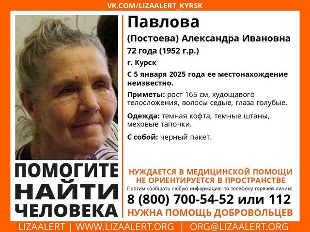 Поисковый отряд «Лиза Алерт Курская область» распространил ориентировку на срочный поиск исчезнувшей 72-летней жительницы областного центра. По данным волонтеров, пропала пожилая женщина 5 января. Вскоре стало известно, что курянка найдена, она жива. Сергей Яшин, по материалам https://vk.com/lizaalert_kyrsk Постоянный адрес новости на сайте «Друг для друга» ~ https://dddkursk.ru/lenta/2025/01/05/115033/. Новости Курска за ~ 5 января ~ январь 2025 года.