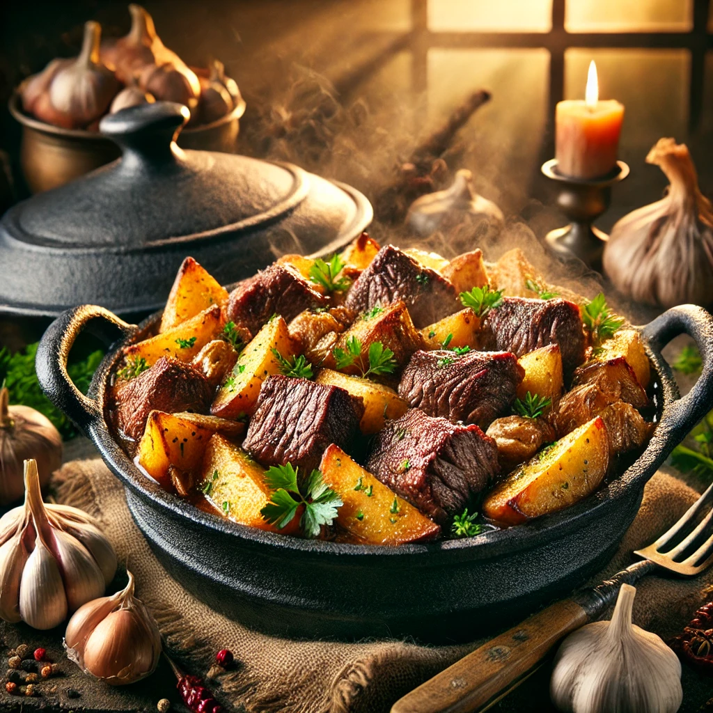 у меня казан для обычных плит с плоским дном на 4,5 литра Ингредиенты: • Говядина (лопатка или мякоть) – 700 г • Картофель – 5–6 крупных клубней • Лук репчатый – 2 шт. • Чеснок – 3–4 зубчика • Растительное масло – 100 мл • Соль, перец – по вкусу • Паприка, чабрец – по желанию • Зелень (укроп, петрушка) – для подачи Приготовление: 1. Подготовка мяса и овощей: • Говядину нарежьте крупными кусками (около 5 см). • Картофель очистите, разрежьте на крупные дольки. Лук порежьте полукольцами, чеснок раздавите ножом. 2. Обжарка мяса: • Разогрейте казан на среднем огне. Налейте растительное масло, хорошо прогрейте. • Обжаривайте куски говядины до румяной корочки со всех сторон. Переложите мясо на тарелку. 3. Обжарка картофеля: • В том же масле обжарьте картофель до золотистой корочки. Уберите картофель из казана. 4. Приготовление: • Верните мясо в казан, добавьте лук и чеснок. Обжаривайте 2–3 минуты, затем добавьте специи и немного воды (чтобы мясо тушилось, но не плавало).