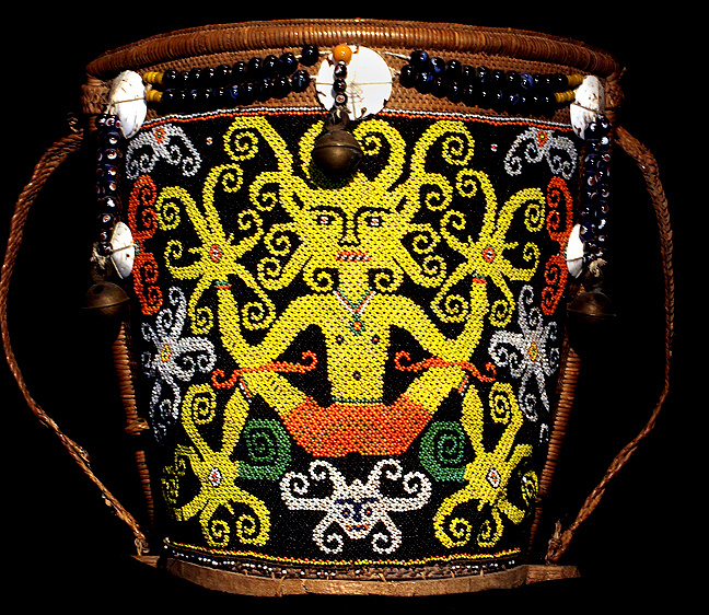 Борнео, третий по величине остров мира после Гренландии и Новой Гвинеи, разделён между Малайзией, Индонезией и богатым нефтью султанатом Бруней. Прибрежное население острова в основном исповедует ислам, но густые тропические леса внутренних районов — это дом коренных народов, известных под общим именем даяки. Одним из самых ярких примеров их культуры является бисерная аппликация, украшающая переноски для младенцев. Переноска племени даяки представляет собой уникальный элемент традиционной культуры этого народа. Такие переноски используются матерями для ношения младенцев на спине, обеспечивая удобство и безопасность. Эти переноски были не просто функциональным предметом, а настоящим произведением искусства и оберегом. Они демонстрировали богатство и престиж семьи, но прежде всего обеспечивали космологическую защиту младенца. У детей из высоких слоев общества переноски украшаются сложными фигуративными мотивами, изображающими человеческие фигуры, тигров или божества Асо. В то время как у