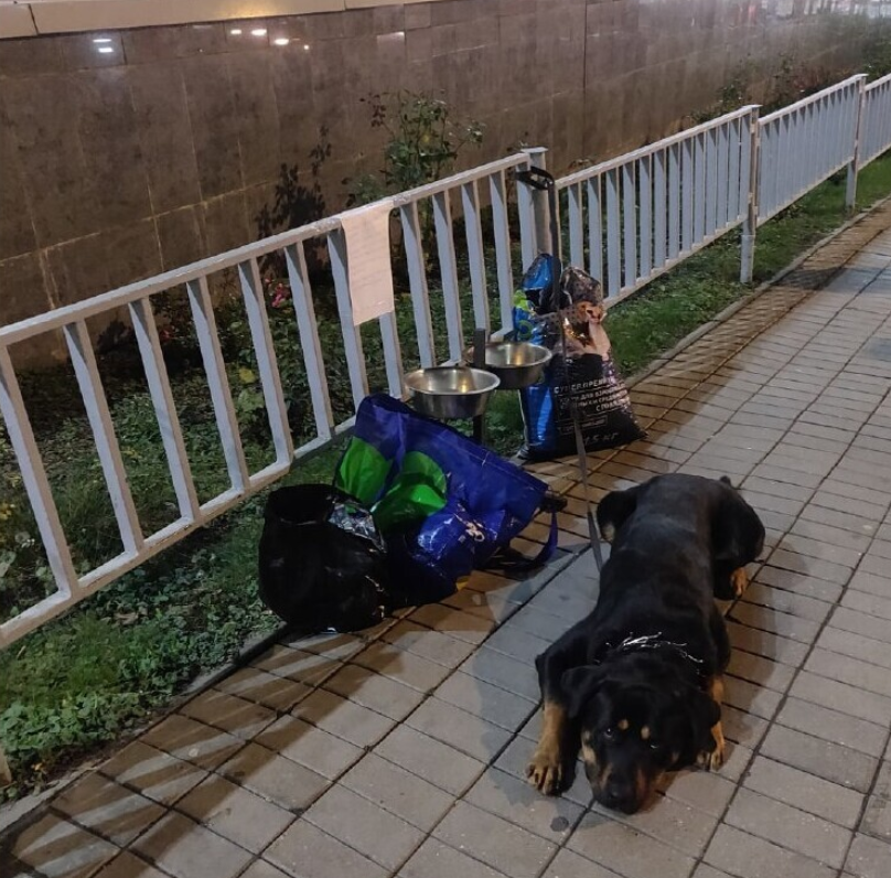 Возле метро "Сокольники", привязанный к железному забору, лежал молодой ротвейлер.