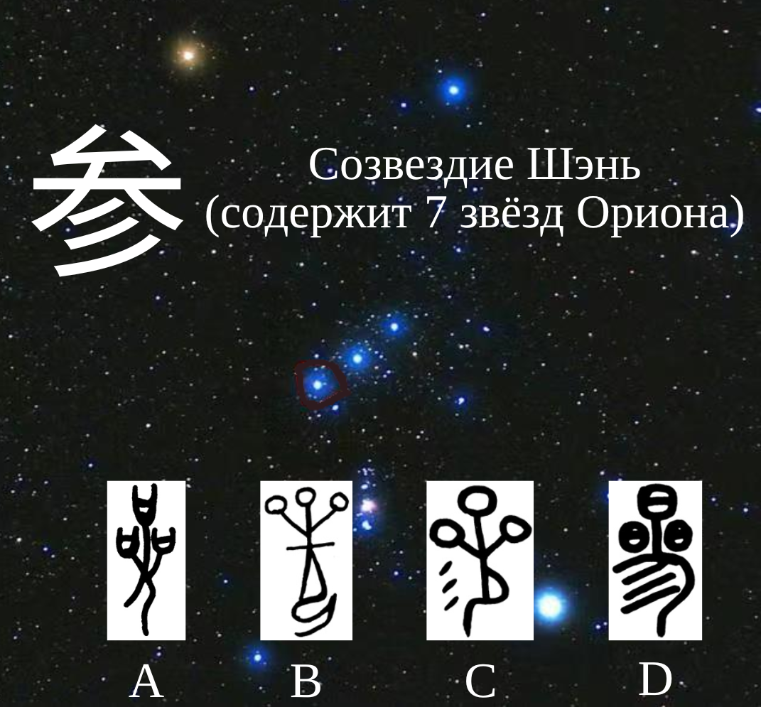 Этимология иероглифа 参 Шэнь (созвездие из 7 звёзд созв. Орион)