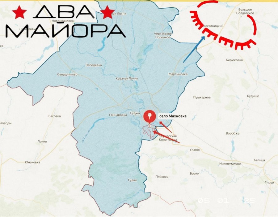Как пишут телеграм-каналы «Два майора» и «Архангел Спецназа», подразделения ВДВ ведут активные наступательные действия южнее города Суджи — на территории Махновского сельсовета. Бои шли в селе Махновка и на хуторе Дмитрюков.