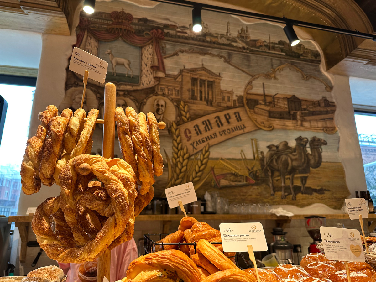 Не все знают, что после того, как Самара стала столицей своей губернии, город пережил настоящий экономический расцвет. Сюда начали стекаться купцы со всей России, а местные земли активно засеивались пшеницей. Для посева предпочитали сорт Белотурка — лучший в стране, из которого производили восхитительную муку-крупчатку, идеально подходящую для выпечки хлеба. Самарская губерния вскоре стала лидером России по производству и продаже пшеницы и ржи, а саму Самару стали называть неофициально хлебной столицей. Под такое историческое наследие в самом центре города недавно открылось кафе "Белотурка", ставшее данью традициям хлебного производства. Мы решили посетить его, чтобы погрузиться в атмосферу прошлого. Пекарня "Белотурка" можно считать сетевыми, ведь в Самаре их целых три. Однако мы посетили заведение, расположенное в самом сердце исторической части города. Кафе разместилось в купеческом доме Подкидышева, который находится на пересечении двух популярных туристических улиц — Куйбышева и Л