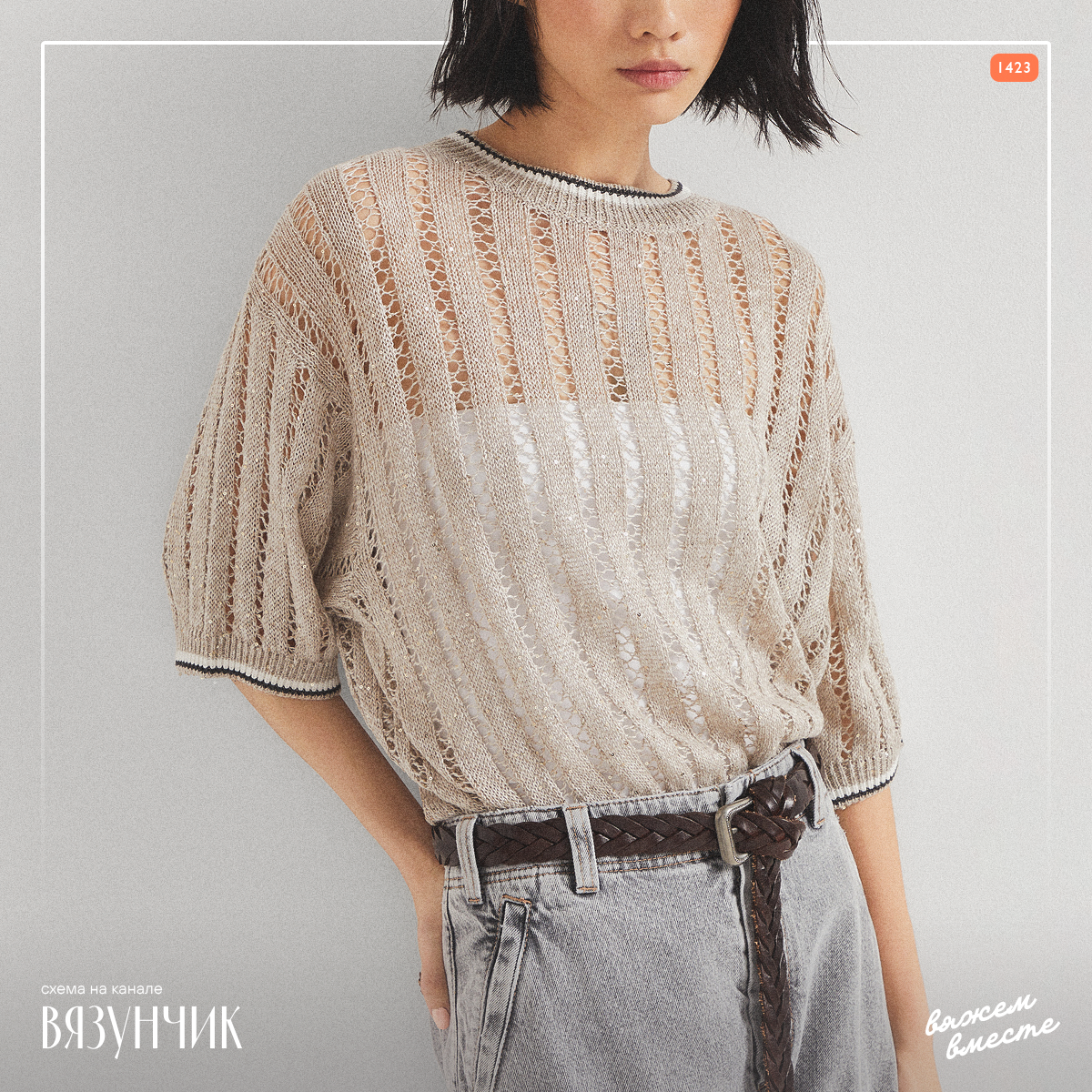 Как написали бы многие, — обычная сетка, ничего интересного. Но пряжа с яркой льняной фактурой, сочетание универсальных цветов, блеск, актуальный крой, подбор комплектующих делают вещь не такой уж обычной. Придётся постараться, чтобы получить схожее впечатление от изделия.