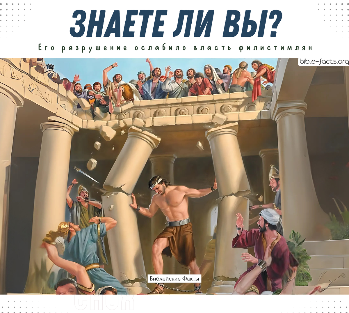 Знаете ли вы, что Самсон убил больше людей в момент своей смерти, чем за всю свою жизнь? (Суд. 16:30) Интересно, что Самсон в одиночку уничтожил филистимскую элиту, ослабив их господство над Израилем. Это одно из самых крупных поражений филистимлян. В момент своей смерти он разрушил храм Дагона, погубив до 3000 человек, включая всех правителей филистимских, которые там находились. (Суд.16:27) P.S. Храм Дагона был главным центром поклонения филистимлян и символом их силы. Его разрушение ослабило власть филистимлян, подорвало веру в их бога и показало, что Бог Израиля сильнее всех идолов. • Больше интересных Библейских Фактов • Телеграмм канал (Библейские факты) • Библейские факты сайт