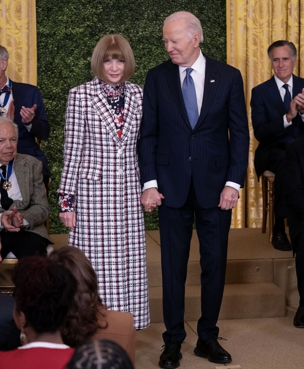 Главный редактор американского Vogue удостоилась Медали Свободы президента США. В Белом Доме собралось немало народу, многих мы знаем в лицо. Решив отметить свой вклад в развитие культуры вот таким способом, Джо Байден не приходя в сознание награждал американцев. Целая группа актеров, музыкантов и даже Анны смогла удостоиться такой чести. Анну, которая даже ночью ходит в темных очках, попросили их снять. На церемонии Сонный Джо не мог с ней расстаться и даже поцеловал в голову. Для церемонии Анна выбрала свое любимое многоцветное колье . На ней пальто и платье Thom Browne: одно из коллекции Весна-2023, другое из коллекции Весна-2025. Среди остальных награжденных: Майкл Фокс ( " Назад в будущее "). Дензел Вашингтон, пытавшийся спасти "Гладиатора-2", но не особенно получилось. Боно. Он не снял очки. Такое впечатление, что президент награждал почти ровесников, строго держась за рамки 50+. Вот и Хиллари. Совсем старенький Ральф Лорен награжден за вклад в модную индустрию.