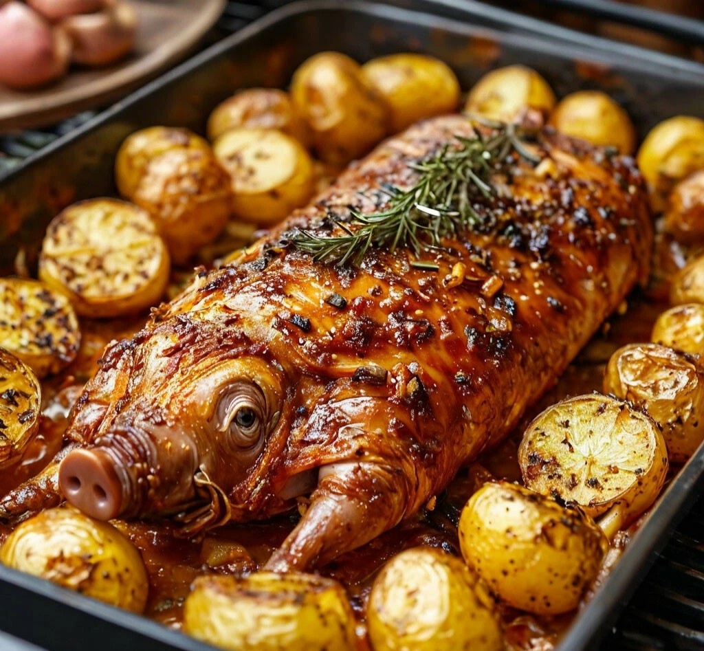 Для приготовления фаршированного поросёнка выбирают 3—4-недельного животного. Его следует выпотрошить, отделить для фарша почки, печень, легкое и сердце, отрубить копытца и вымочить в холодной воде не менее двух суток, меняя воду не реже двух раз в сутки. Без воды держать поросёнка не следует, так как на воздухе мясо темнеет. Для фарша взять 1кг готовой гречневой каши, обжаренные и протушенные, затем мелко нарезанные почки, печень, лёгкое, сердце и 50 г сливочного масла. Фарш посолить, поперчить щепоткой перца и вымешать. Приготовленным фаршем начинить поросёнка, зашить или плотно увязать разрез, зажарить на раскаленном противне на плите и довести до готовности в духовке. Затем снять шпагат, переложить поросёнка на большое блюдо, украсить зеленью петрушки, кусочками лимона (по краям блюда), отваренными овощами, хрустящим картофелем. Разрезат