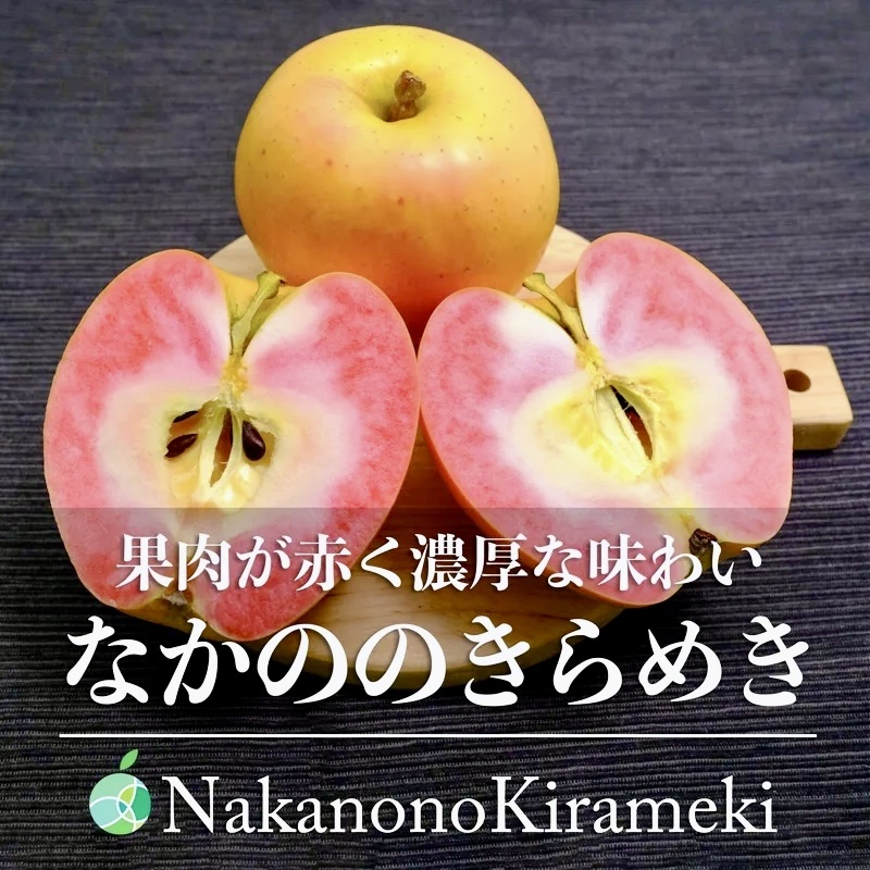 Nakano no Kirameki - это яблоко, которое Кадзуо Ёсия, культивировал в течение многих лет, целенаправленно занимаясь продвижением группы яблок яблок с красной мякотью. Сорт появился на свет в городе Накано, префектура Нагано, является потомком яблок, которое он выращивал, скрещивая красномякотный сорт "Irodori" и сорт с хорошим вкусом "Orin". Nakano no Kirameki, как и "Иродори", имеет красную мякоть, но ее кожура оранжево-красная в желто-зеленом базовом цвете, это то, что делает его уникальным и привлекательным. ( по мне так внешне яблоко, очень напоминает сорт Hidden rouse) Заявка на регистрацию сорта была подобна в 2014 году, такая же, как и яблоко "Irodori", но была зарегистрирована как разновидность только в 2018 году. Внешний вид Nakano no Kirameki слегка вытянутый, а вес от 300 до 350 г. Цвет кожи - это желто-зеленый базовый цвет с сильным желтым, и легкий оранжево-красный цвет, как будто на него влияет цвет мякоти внутри, воска практически нет. Мякоть имеет интенсивны пе