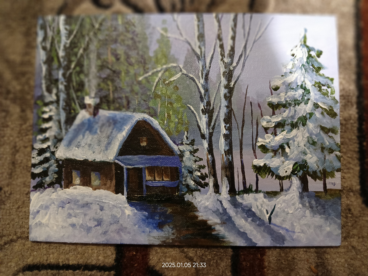 Казался пейзаж таким лёгким, но засела на три часа! Зимний коттедж в лесу. Холст 18*24, акрил. Холст от Малевичъ, акрил сбродный. Результатом особо не довольна, к сожалению. Акриловые белила просто ужасны. В процессе работы сменила на Гамму. От Гаммы не особо укрывистость, примерно как и от Малевичъ, но годные. Хоть не как вода. Может быть, Когда-то переделаю эту работу. Когда руки дойдут.