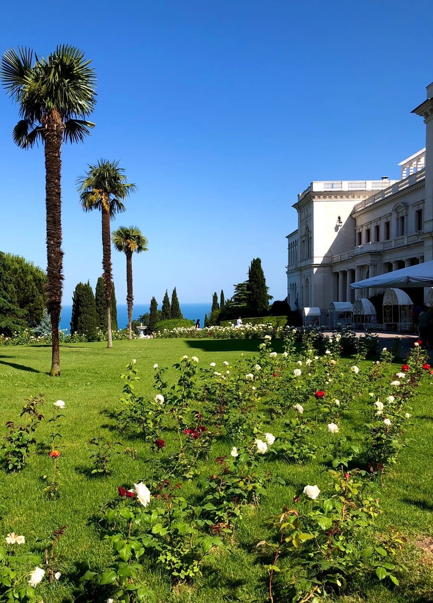 Ливадийский дворец — парад цветения роз! Роза «Ливадия» — белоснежный сорт, шедевр современной селекционной науки. Она высажена у фонтана на партере перед входом во дворец.