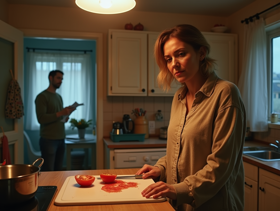 Марина устало опустила нож на разделочную доску. День выдался особенно тяжелым — бесконечные отчеты, недовольный начальник, пробки по дороге домой... Единственное, что грело душу — мысль о спокойном вечере и долгожданном ужине вдвоем с мужем. Она специально купила свежие овощи для его любимого греческого салата.