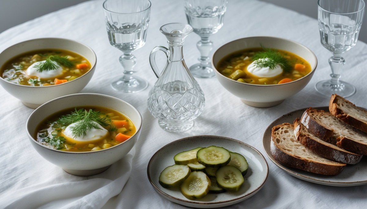 Исцеляющий рассольник: вкусный суп и секреты восстановления Тёплые воспоминания о бабушкиной кухне всегда согревают душу, особенно когда речь заходит о спасительном рассольнике после шумных праздников. Помню, как в детстве я часто просыпалась от звона кастрюль на кухне. Это бабушка Вера, в своём неизменном ситцевом переднике с васильками, колдовала над плитой ранним утром. Особенно часто эти звуки раздавались после больших праздников, когда взрослые собирались за большим столом, а наутро нуждались в особом "лечении". "Внученька," – говорила она мне, подзывая к плите, – "запоминай главное бабушкино средство. Рассольник – это не просто суп, это настоящее спасение для души и тела." 1. Подготовка перловки (бабушкин секрет): 2. Бульон: 3. Подготовка овощей: 4. Приготовление зажарки: 5. Сборка супа: 1. Выбор огурцов: 2. Рассол: 3. Хранение: 1. Вегетарианская версия: 2. Экспресс-вариант: Бабушка всегда говорила: "Главное в рассольнике – это любовь, с которой ты его готовишь. И обязательно