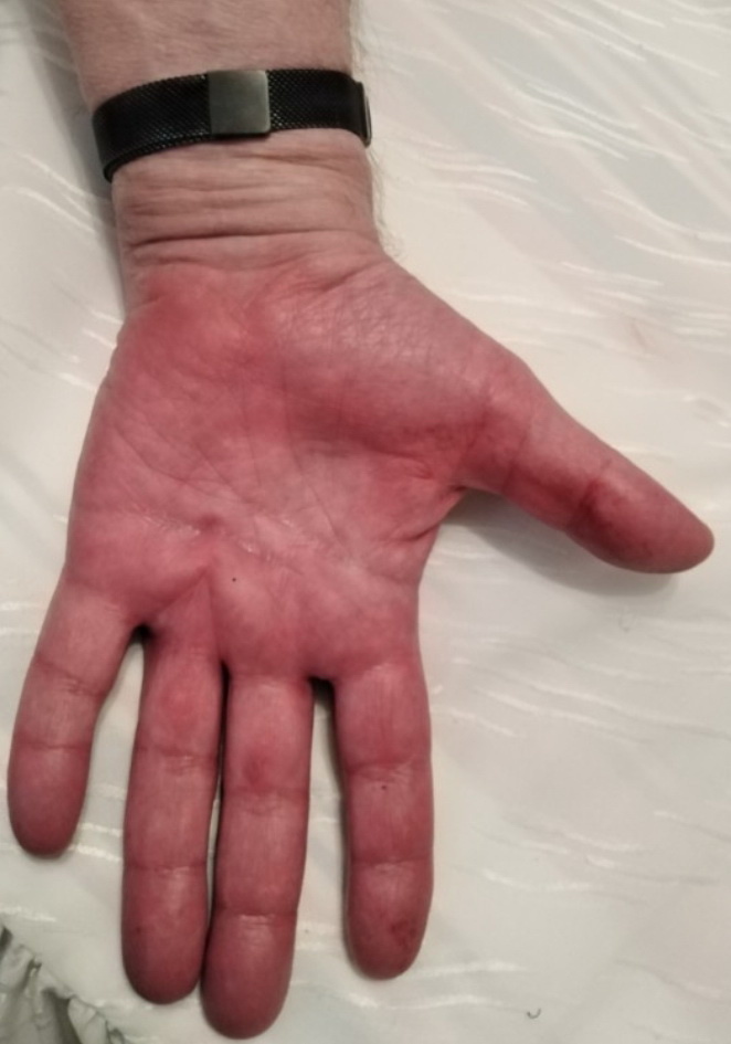 Некоторые изменения внешности человека позволяют поставить ему ориентировочный диагноз на основании простого осмотра. Конечно, врач никогда не ориентируется только на эти признаки (иногда их называют «стигмы»), но они могу помочь в диагностике. В неделю перед Новогодними праздниками у меня было несколько пациентов, у которых были настолько яркие внешние симптомы их заболеваний, что я решил рассказать о них читателям. Краснота ладоней может быть признаком таких заболеваний, как печёночная недостаточность, ревматоидный артрит. Но наиболее красные ладони типичны для полицитемии. Для этого заболевания типично повышение уровня гемоглобина (так называемое «сгущение крови»). Пациент, фото ладони которого вы видите выше, уже более 10 лет страдает истинной полицитемией, подтверждённой генетическим тестом. Повышение уровня гемоглобина требует анализа на патологию гена JAK-2 - янус-киназы. При появлении этой мутации (она не врождённая, а приобретённая), повышается чувствительность кроветворных к
