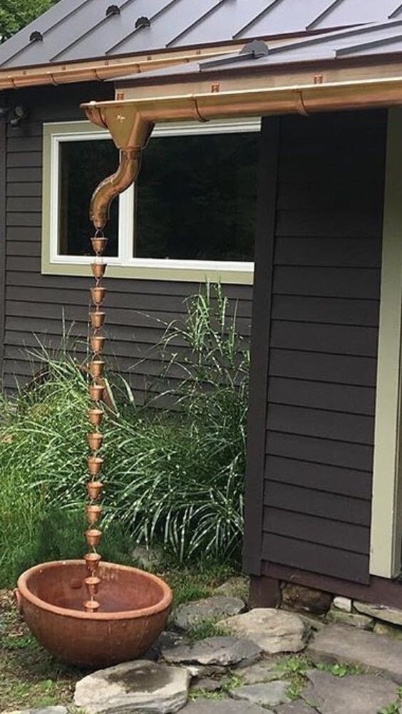 Дождевые цепи, или Kusari-Doi придумали в Японии несколько веков назад. Это устройство с успехом заменяет водосточную трубу для небольшого здания: одноэтажного дома, беседки и т. Д. Умельцы мастерят такие цепи сами, используя виртуозно обрезанных горловин пластиковых бутылок на прочной леске, камни, детские ведерки - леечки, цветочные горшки и даже посуду. В климате с суровыми зимами лучше не использовать емкости в конструкции цепи, чтобы избежать сильного заледенения и обрыва цепи. К примеру, в Норвегии, где обожают подобный элемент декора, обычно подвешивают оригинальную крупную цепь, с извилинами и витиеватыми узорами, которая сама по себе является шедевром кузнечного искусства. Преимущества дождевой цепи по отношению к трубе: · её не нужно крепить к стене, достаточно зацепить сверху у жёлоба и снизу у дождеприёмника, чтобы не болталась; · не нужно решать проблему возможного замерзания воды в трубе, если цепь из-за капризов погоды покроется льдом, сколоть его не составит труда · е