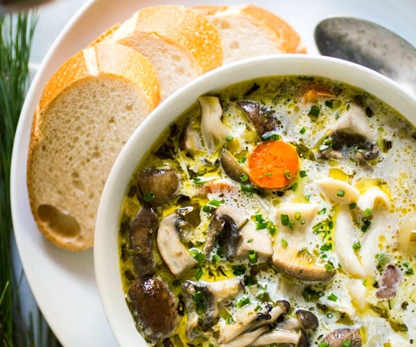 ИНГРЕДИЕНТЫ/6-8 ПОРЦИЙ: 4 толстых полоски бекона, 1 лук-порей, 3 стебля сельдерея, 3 средние моркови, 2 крупных измельченных зубчика чеснока, 1 ч.л измельченного свежего тимьяна, 1ч.л измельченного свежего розмарина, 1 лавровый лист, 1/3 стакана сухого хереса, 4 чашки куриного или говяжьего бульона, 450 г мелкого картофеля, 700 г лесных грибов, 1/2 стакана половинок или жирных сливок, соль, перец, зеленый лук.