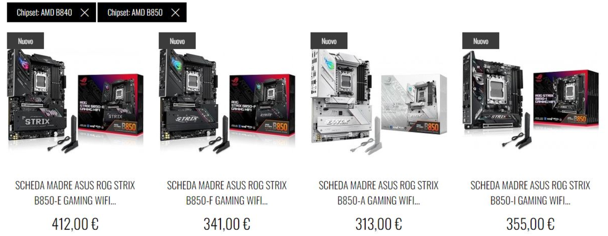 Осталось не так много времени, прежде чем стартует презентация будущих материнских плат AMD 800-й серии. Хотя презентация будет в основном посвящена моделям материнских плат, характеристикам и ценам, один розничный продавец уже выставил несколько из этих материнских плат для предварительной покупки. Итальянский ритейлер Info Graf Store разместил на сайте девять различных моделей материнских плат ASUS с чипсетами B850 и B840, раскрыв подробные характеристики, дизайн и цены в этом регионе. В линейке имеются семь материнских плат с чипсетом AMD B850 и две платы на базе AMD B840, входящие в популярные линейки ROG Strix, TUF Gaming и PRIME. В линейку ROG Strix входят четыре модели материнских плат ASUS B850 среднего класса, включающие материнские платы форм-фактора ATX и m-ATX с поддержкой процессоров AMD Ryzen 9000 и новейшими функциями подключения. ROG Strix B850-E Gaming WiFi: 412 евро или 425 долларов США (включая НДС); ROG Strix B850-F Gaming WiFi: 341 евро или 351 доллар США (включая