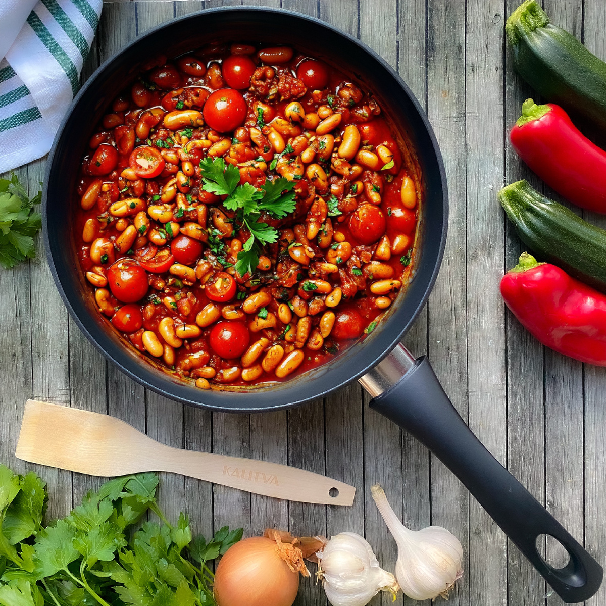 Лобио с фасолью и помидорами — это насыщенное, ароматное блюдо кавказской кухни, которое прекрасно дополнит ваш стол. Его можно подавать как основное или как гарнир. ✅ Фасоль (красная или белая) — 1 стакан ✅ Помидоры — 3 шт. (или 300 г консервированных в собственном соку) ✅ Лук репчатый — 1 большая луковица ✅ Чеснок — 3 зубчика ✅ Зелень (кинза, петрушка) — по вкусу ✅ Аджика (или молотый красный перец) — ½ ч. л. ✅ Хмели-сунели — 1 ч. л. ✅ Соль — по вкусу ✅ Растительное масло — 2 ст. л. 1️⃣ Замочите фасоль в холодной воде на ночь. Это сократит время варки и сделает её более мягкой. 2️⃣ Варка: варите фасоль в свежей воде без соли, чтобы она быстрее сварилась. Добавьте соль в конце готовки. 1️⃣ Замоченную фасоль отвариваем до мягкости (примерно 1,5 часа), сливаем воду и отставляем в сторону. 2️⃣ В сотейнике PYRAMID разогреваем растительное масло. Обжариваем мелко нарезанный лук до прозрачности, затем добавляем измельчённый чеснок и готовим ещё минуту. 3️⃣:Нарезаем свежие помидоры кубиками