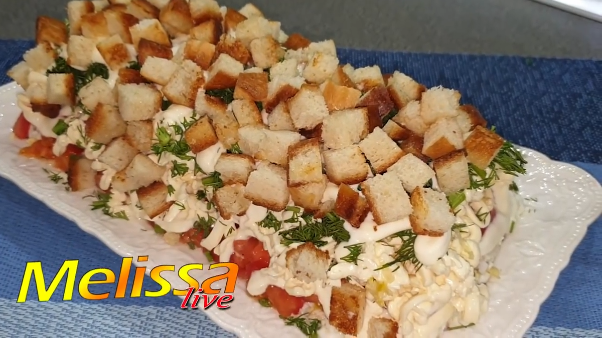 Привет, друзья! Сегодня я готовлю вкусный салат - обязательно приготовьте его! Начну с гренок. У меня есть белый батон, мне понадобятся 3 кусочка. Можно брать белый хлеб, багет. Ломтики батона я нарезаю на маленькие кубики. Ставлю на огонь разогреваться сковороду с 2-3 столовыми ложками растительного масла. Выкладываю нарезанный хлеб в хорошо разогретое масло. Предварительно в масло можно добавить раздавленный зубчик чеснока, либо веточку розмарина, немного подержать и удалить. Только затем добавлять батон - так гренки будут ещё более ароматные. Гренки я буду обжаривать до красивого золотистого цвета, помешивая, на небольшом огне. Готовые гренки выкладываю в тарелку, чтобы они немного остыли. У меня 200 грамм копчено-вареной свинины. Можете брать любое мясо, только чтобы оно было сочное. Нарезаю мясо тонкой полосочкой. По желанию можно нарезать кубиками. Салат можно собирать в разъемного кольце, или просто в блюде, или порционно. Самый нижний слой - мясной. Следом я добавляю майонез. М
