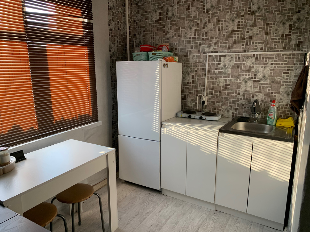 Добрый день, друзья! Как и обещала, пишу пост о обустройстве служебной квартиры. Вот так у нас вышла кухня. До обустройства на кухне были два старых стола, один выбросили, другой оставили как дополнительную рабочую зону при готовке. Также были жалюзии и поклеены старые некрасивые обои. Вот во сколько вышло нам обустройство: 1. Поклейка обоев - 1500 2. Стол - 1820 3. Куханный гарнитур + б/у мойка + смеситель с сифоном - 10.000 4. Холодильник - 20.000 5. Плитка электрическая - 1300 6. Электропечка - 2600 7. Посуда (кастрюли, сковородка, контейнеры, тарелки) ~ 4000 8. Табуреты 4 шт - 2200 9. По мелочи (бутыль с помпой, нож, доска, половник, менажница и т.д.) - 3000 10. Чайник электрический (пришлось купить новый, старый начал течь) - 2000 Итого кухня обошлась в 48.420 руб. Дороже всего обошлась. Гостиная вышла подешевле, так как обои нормальные и имелись 2 дивана. Также из техники был принтер и конвекторный обогреватель. Муж покупал пару лет назад. Итак, вот что мы приобрели: 1. Матр