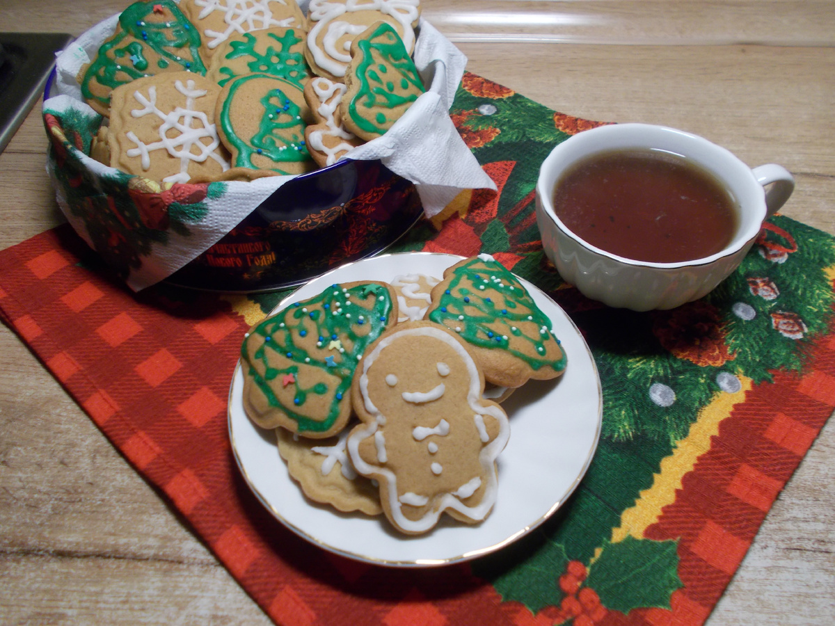 Поздравляю всех с наступающим Рождеством Христовым! Выпечку мы делаем не только на праздники. Но на Рождество, у многих, принято печь пряники. Пряники приятно готовить с детьми или внуками. Детям нравиться это занятие, особенно если есть интересные формочки. Выложите в кастрюлю с толстым дном масло, мед и сахар. Включите на плите самый маленький нагрев. Растопите все продукты до жидкого состояние и доведите до кипения. Всыпьте в медовую массу пряности, перемешайте и проварите 2-3 минуты. Всыпьте соду и перемешайте. Масса должна стать пышной. Проварите массу пару минут. Перелейте жидкую основу в другую посуду. Остудите основу для пряников до 60-70 градусов. Если вы будите украшать пряники, то разделите белок и желток. Белок пойдет на украшение. Если украшать не будите, добавьте в тесто целое яйцо. Я буду пряники украшать, поэтому яйцо разделила. Желток перемешайте вилкой и выложите в медовую основу. Всыпьте 450 грамм муки и перемешайте ложкой тесто. Оставшуюся муку насыпьте на стол и в