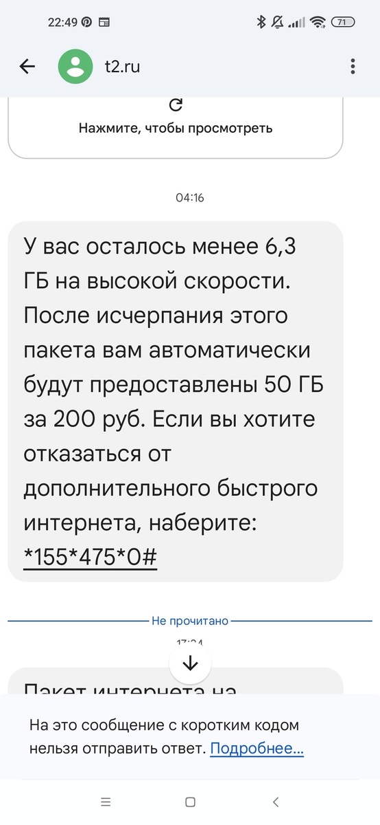 Пользуюсь услугами данного оператора на протяжении многих лет. Не всё идеально, но меня категорически устраивало. У меня был подключён архивный тариф "Безлимит 650" - 500 минут, 50 смс, но самое главное безлимитный стабильный интернет. Который, по работе был нужен всегда и везде: оперативно связаться в мессенджере, быстро нагуглить важную информацию и просто развлечся в дороге. Естественно, за 10 лет стоимость тарифа пару раз повышалась, но поскольку альтернативы не находила - меня это устраивало. И вот, утром я получаю это замечательное смс. Так как у меня такое впервые - я зашла в личный кабинет, чтобы посмотреть, что за прикол такой. А там, меня ждал новый, ещё более приятный новогодний подарок. Теле2, у вас всё в порядке? Вы урезаете мне основную функцию, из-за которой я преданно пользовалась вашими услугами долгие годы и ещё и увеличиваете стоимость этой функции? Обидно, но похоже, что пора искать альтернативу. Буду благодарна, если кто-то в комментариях подскажет другого оператор
