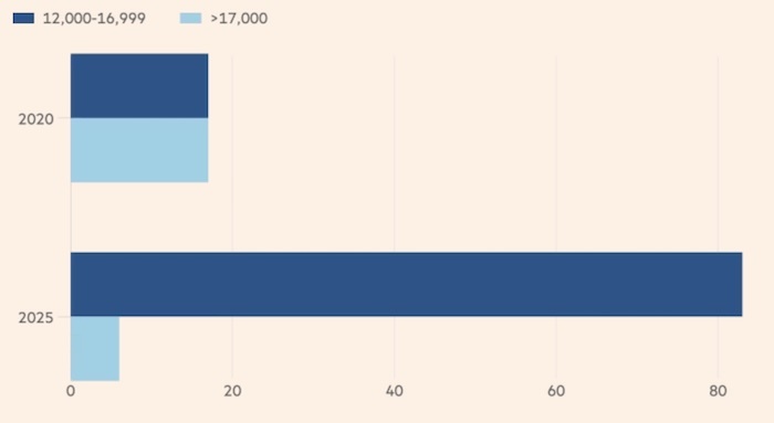 По данным судового брокера Braemar, в 2025 году ожидается поставка всего шести контейнеровозов, способных перевозить более 17 000 20-футовых контейнеров (TEU), по сравнению с 17 судами, поставленными в 2020 году. При этом в 2025 году планируется завершить строительство 83 среднеразмерных судов вместимостью от 12 000 до 16 999 TEU, что почти в пять раз больше, чем пять лет назад.