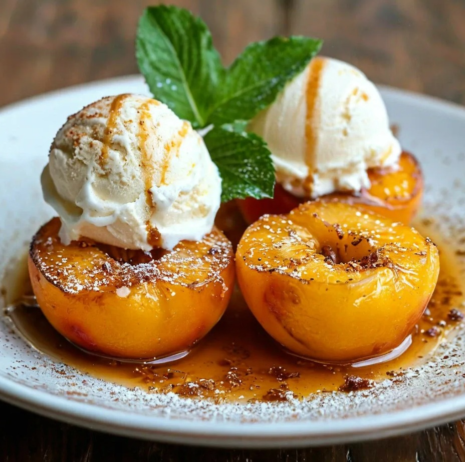 Запеченные персики с мороженым — это простой и изысканный десерт, который идеально подходит для вечера. Этот десерт сочетает в себе восхитительные запеченные персики и холодное мороженое. 🧡