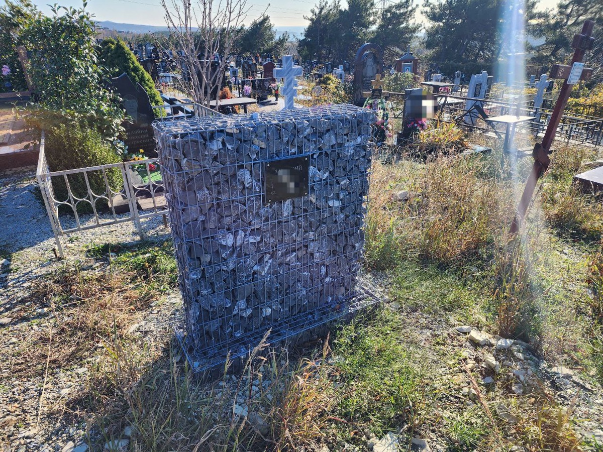 Габион - оригинальный подход к сохранению памяти о человеке. Сплетённые из оцинкованной проволоки формы - ящики, заполняемые камнем при укладке на место — Габионы. Достаточно оригинальный подход к сохранению памяти о человеке, но существуют плюсы и минусы к такому подходу. К плюсам можно отнести конечно низкая финансовая стоимость, оригинальность, прочность, надежность, относительная долговечность. К минусам целесообразно отнести все-таки не очень эстетичный вид, нет четкой форменности, строгости, при осадке почвы или размыве грунта габион деформируется, со временем в промежутках между камнями или другими наполнителями может поселиться нежелательная живность. Данную конструкцию могут превратить в дом и змеи, которые на новом кладбище Геленджика естественно существуют. Ну и конечно один из явных и очевидных минусов данной конструкции - это все-таки изготовление таблички с данными усопшего. В данному случае табличка изготовлена из гранита с ФИО и датами, однако если устанавливать