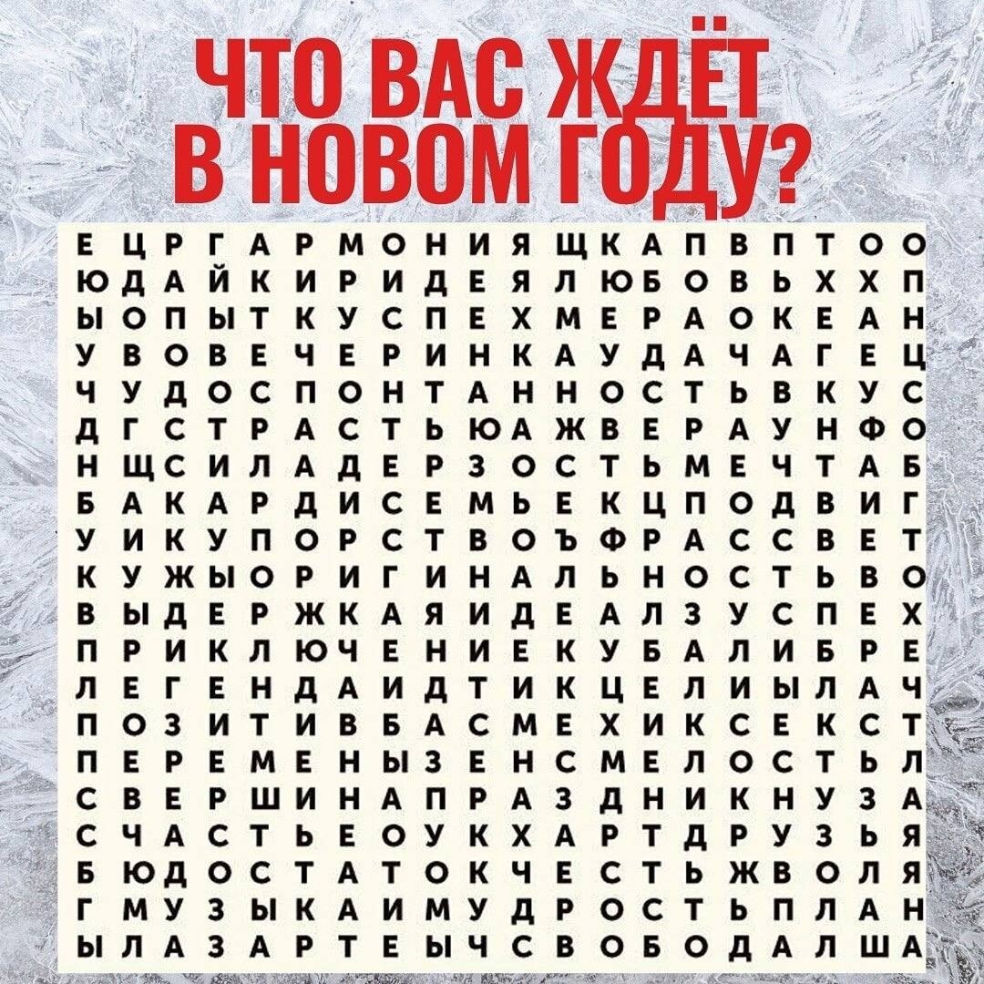 Знаете, уже пару лет мы с вами играем в эту игру - смотрим на картинку и взгляд наш выхватывает отдельные слова. По задумке, первые три слова, которые увидишь - это девиз, с которым нужно прожит предстоящий год. Да, возможно, игра наивная или даже несправедливая. Но сейчас же новогодние каникулы! А значит это то самое время, когда хочется отключить голову взрослого человека и забыть о бытовых неурядицах или семейных проблемах. Хочется снова верить в чудеса, шепотом загадывать желания, и искренне радоваться даже самым простым мелочам. Забавно, но вроде бы таблица одна и та же каждый год. Но мне каждый раз видятся на ней все новые и новые слова. Полистала архив публикаций и нашла, что в январе 2023 я увидела: приключение + праздник + успех. И действительно, тот год был наполнен веселыми приключениями и запоминающимися праздниками. А вот с успехом не срослось - видимо, я мало приложила труда для достижения этой цели. Или прикладывала не в той области :-) А вот в январе 2024 я почему то не