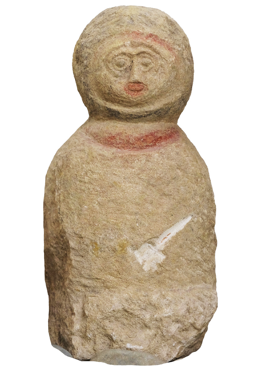 Этот памятник представляет собой антропоморфную стелу — полуфигуру из известняка серовато-белого цвета. На ней выделяются покатые плечи и овальная голова с схематично проработанным лицом: круглыми глазами, вытянутым треугольным носом и овальным ртом. Голова закутана в платок, окрашенный в чёрный цвет, следы этой краски видны на голове и груди. Складки платка и губы выделены красной краской.