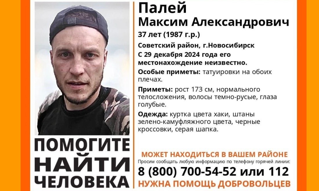 37-летний сибиряк пропал в Советском районе областной столицы 29 декабря 2024 года. С тех пор о нём ничего неизвестно. Ориентировку на поиски на своей странице в ВК опубликовали волонтёры поисково-спасательного отряда «ЛизаАлерт Новосибирская область». Пропавший ростом 173 см, у него тёмно-русые волосы и голубые глаза. Среди особых примет — татуировки на обоих плечах. В день исчезновения на мужчине была куртка цвета хаки, штаны камуфляжного цвета, чёрные кроссовки и серая шапка. В комментариях к посту новосибирцы сообщили о неизвестном пациенте в горбольнице №3. Также похожего человека видели на ОбьГЭсе и в Бердске. Всех, кому что-либо известно о пропавшем, просят сообщить об этом по телефону горячей линии: 8-800-700-54-52 (круглосуточно, бесплатно) или по номеру 112.