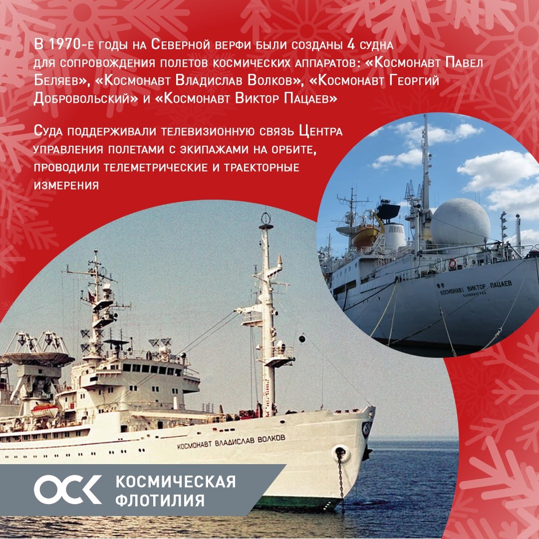 60-е и 70-е годы XX века ознаменовали рассвет космической эры, и здесь наша страна вновь занимает лидирующие позиции. Для обеспечения работы космических судов на Земле нужен был особый флот, который смог бы сопровождать полеты космических аппаратов и обеспечивать телевизионную связь Центра управления полетами с экипажами на орбите. Корабелы ответили на вызов — в 1970-е годы на предприятии ОСК Северная верфь были созданы 4 судна для сопровождения полетов космических аппаратов: «Космонавт Павел Беляев», «Космонавт Владислав Волков», «Космонавт Георгий Добровольский» и «Космонавт Виктор Пацаев». «Космонавт Виктор Пацаев» до 2017 года обеспечивал связь с МКС. Сегодня уникальный корабль ошвартован на набережной исторического флота Музея Мирового океана в Калининграде. На этом посте мы завершаем наш небольшой новогодний экскурс в историю судостроения. Сегодня на судостроительных заводах ОСК, сохраняя вековые традиции, корабелы продолжают создавать новые и мощные корабли и суда: атомные подво
