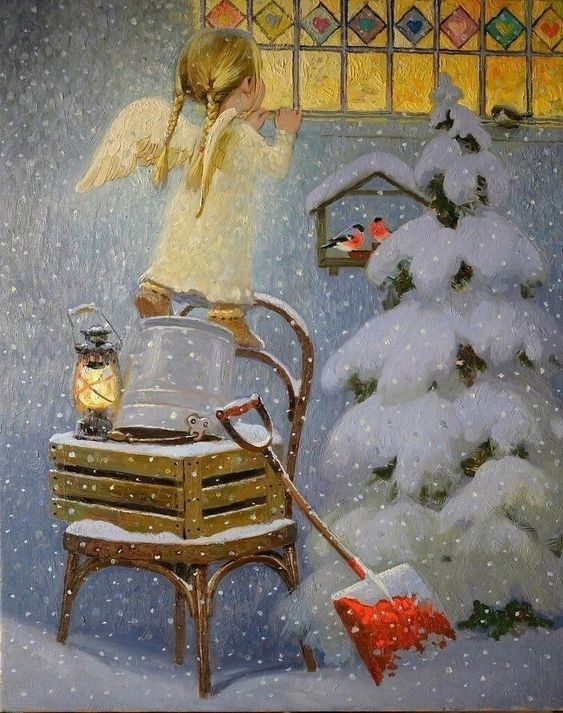 Праздник в доме, так радостно светятся огни. И ангелы радуются вместе с нами Рождеству Христову, они совсем рядом с нами – вот такие милые прелестные ангелы. И снег вокруг мягкий и пушистый, он тоже искрится и светится, потому что и в природе – праздник.