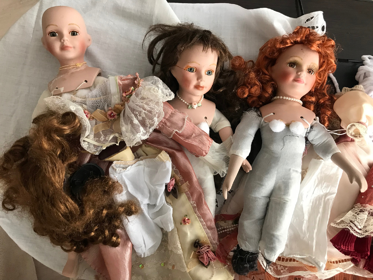 Дорогие друзья , вчера мне принесли вот такой набор для творчества . Куклы были чумазые и лохматые, с дефектами рук и ног. С загрязнениями на лицах я быстро справилась, ноги и руки , которые были в наличии , я тоже достаточно быстро вернула на место Разбитый бюст пришлось переклеить Судя по всему чинили на скорую руку Хорошо , что горячий клей быстро отделяется от деталей, убрать его не составило труда . Заклеивала обратно супер клеем Стыки заметны, но не на столько, как это было раньше . Очень красивый бюст Эта девочка больше всех пострадала, у неё не оказалось ноги . Я предприняла несколько попыток на восстановление конечности - пыталась залить недостающую деталь алебастром. Итог - провал . Нога треснула. Вторая попытка - жидкий пластик - я не пользовалась им больше года, залила в пластилиновую форму, упустив из внимания тот факт, что при отвердении он даёт тепло - прям много , форма становится горячей. Итог - пластилин растаял и вместе с пластиком вытек мне на руки . П