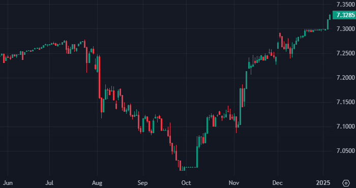 На торгах в понедельник оншорный юань (CNY) продолжает дешеветь против доллара, хотя американская валюта находится под давлением по всему спектру рынка. Одновременно с этим Банк Китая дает понять, что ему происходящее не нравится. Курс USDCNY интервалами 1 день На торгах в понедельник оншорный юань (CNY) опустился до нового многомесячного минимума против доллара, продолжив начатое в пятницу снижение. И это при том, что американская валюта находится под давлением по всему рынку вторую сессию подряд. Одновременно с этим Банк Китая продолжает устанавливать официальный курс USDCNY не только ниже рынка, но и заметно ниже прогнозов аналитиков. Кроме того, подконтрольные Пекину СМИ пишут о том, что регулятор посылает сигналы о намерении стабилизировать национальную валюту. Все это может говорить о том, что Банк Китая недоволен ослаблением юаня. На рынке популярно мнение о том, что вероятная эскалация торговой войны между США и Китаем после возвращения Дональда Трампа в Белый дом вынудит Пекин