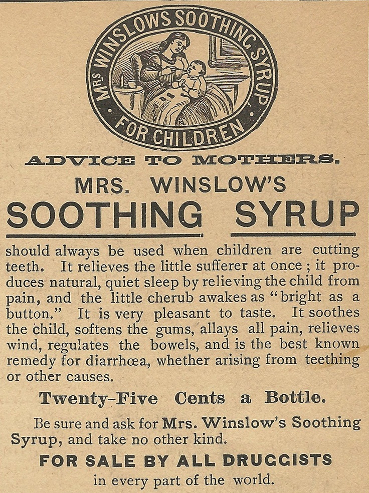 Знаете один из самых частых запросов педиатрам? Успокоительный сироп. Ну чтоб малыш спал покрепче, не так сильно кричал на зубки, не так сильно проказничал. Думаете, этот запрос возник только сейчас? Ан нет, всегда такое было. Вот он: успокоительный сироп Миссис Уинслоу. Уникальное, сплошь натуральное и хорошо изученное средство. Это не я придумала, это так реклама тех лет гласит. Рекомендовался при коликах, нервозности, болях при прорезывании зубов, дизентерии (так тогда диарею называли). Чудо, правда? Впервые сироп был выпущен в 1845 году и произвёл фурор - лекарство и правда работало! Дети спали как зайчики и переставали жаловаться на всё, на что можно пожаловаться в таком возрасте. Прибавьте к этому массивную рекламную компанию - и вот он, рецепт успеха! Правда, иногда дети умирали, но разве это может быть от безобидного сиропа заботливой миссис? Да ещё с такой красивой картинкой на упаковке, в изящной бутылочке... Может. Состав сиропа не указывался на упаковке и менялся нескольк