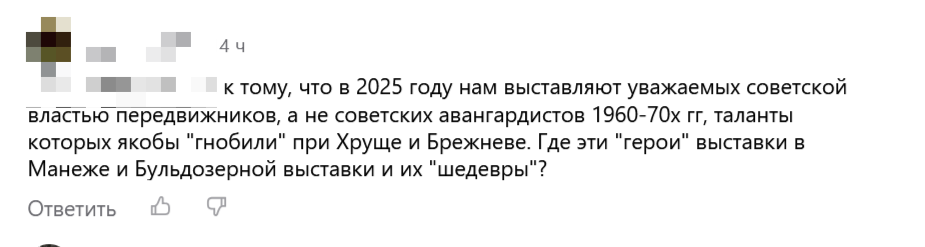 В комментарии к моему небольшому рассказу о посещении выставки «Передвижники» зашел читатель, который, видимо, искренне считает, что художники, принимавшие участие в 1974 году в «Бульдозерной выставке» ныне «благополучно забыты», потому как «…в 2025 году нам выставляют уважаемых советской властью передвижников, а не советских авангардистов 1960-70х гг, таланты которых якобы «гнобили» при Хруще и Брежневе. Где эти «герои» выставки в Манеже и Бульдозерной выставки и их «шедевры»?...» Что-то сразу вспомнился немного баянистый анекдот примерно 20-летней давности: «Брежнев читает западные и самиздатовские отзывы о «Бульдозерной выставке»: «это преступление против свободы творчества... красный сапог на горле культуры... варварская выходка... гневно осуждаем... передовая общественность не допустит... деятели культуры протестуют»...