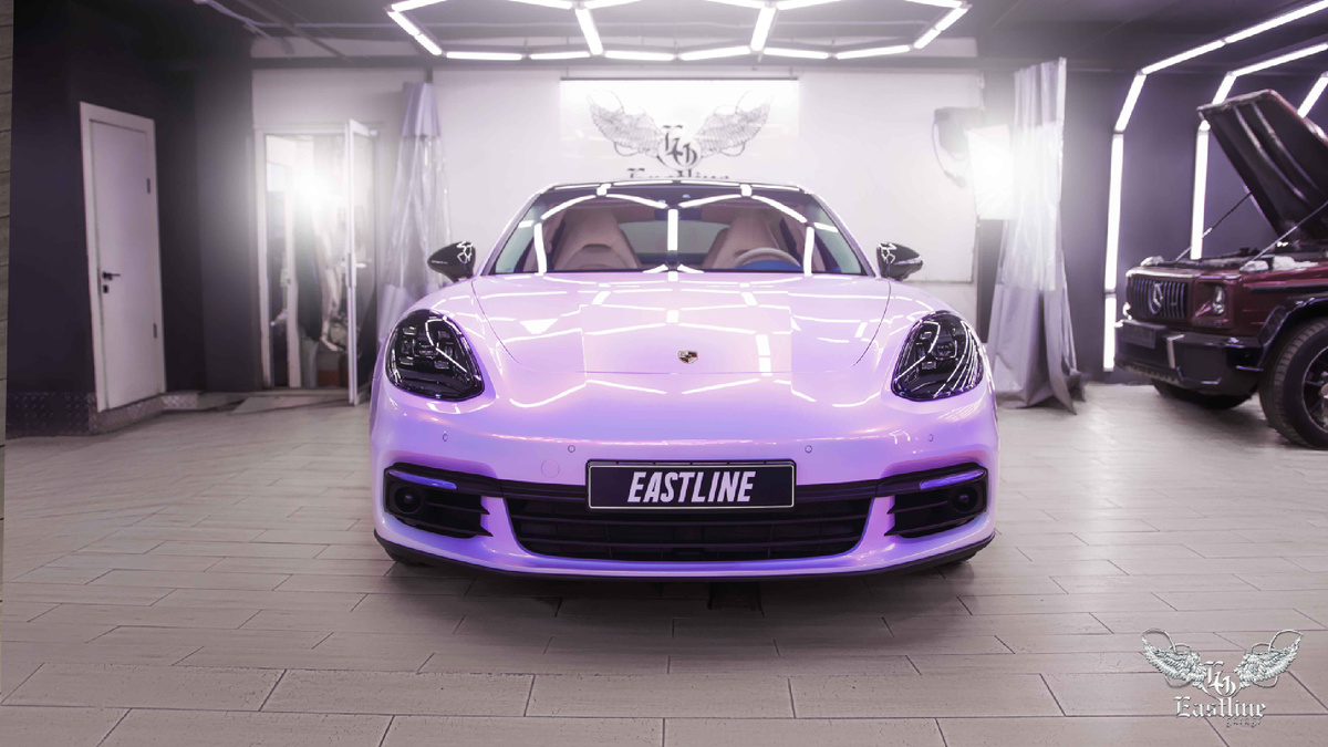 Жемчужина от Eastline Garage: оклейка кузова Porsche Panamera в цветной полиуретан и перетяжка салона.