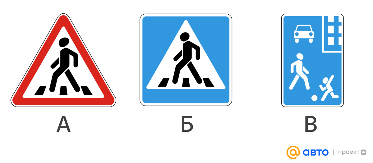 Пешеходы делят дороги с транспортными средствами уже очень давно. Чтобы аварий с наездом на людей было как можно меньше, а в идеале вообще нисколько, в ПДД предусмотрены знаки, предупреждающие водителей о людях на дороге или близ нее. Среди них знаки, обозначающие пешеходные переходы, жилые зоны и так далее. Многие из них четко определяют, кто, кому и где должен предоставлять преимущество. Знаете ли вы, какие из приведенных знаков обозначают участки, где водители обязаны уступить дорогу пешеходам? Вспомните ПДД и ответьте правильно. На всякий случай мы приготовили для вас правильный ответ и пояснения к нему. Это если вдруг память вас подвела и эта часть правил дорожного движения как в тумане. Внимание: ниже есть правильный ответ Правильный ответ: Б и В Знаки: «Б» — 5.19.2 «Пешеходный переход», «В» — 5.21 «Жилая зона» предоставляют преимущество пешеходам на проезжей части на обозначенных ими участках дорог, территориях. Предупреждающий знак «А» — 1.22 «Пешеходный переход» предупреждает