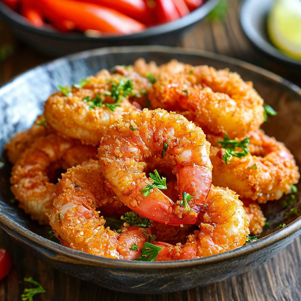 Ингредиенты: Креветки – 300 г пшеничная мука – 3 ст. л. панировочные сухари – 5 ст. л. яйцо – 1 шт. соевый соус – 1 ч. л. соль, перец, специи – по вкусу растительное масло – для жарки. Креветки очистить, приправить солью, перцем и специями, обвалять в муке, затем в яйце и панировочных сухарях. Обжарить до золотистой корочки. 👇 Подписывайтесь и ставьте лайк, если рецепт вам понравился! 👇