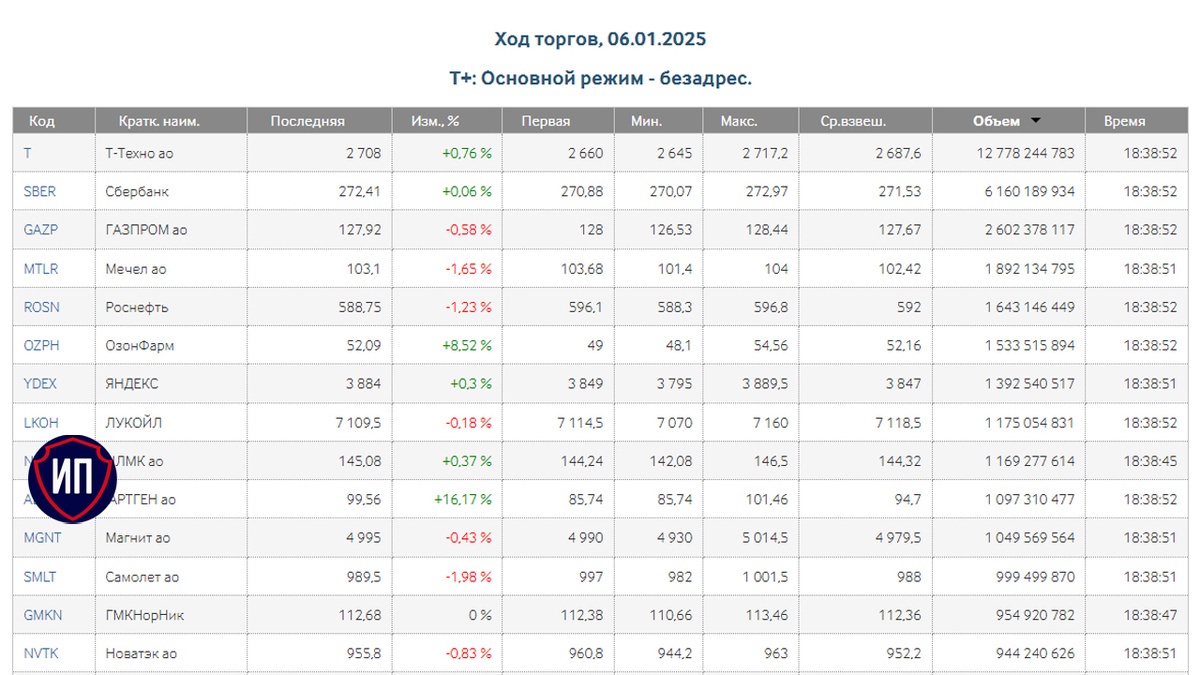 Новогодняя эйфория понемногу проходит, хотя праздничные дни еще продолжаются. Основные объемы продаж пришлись сегодня на акции Т-Технологии, Сбербанка и Газпрома. Понятное дело, что объемы пока еще не дотягивают до средних, но так ведь и частные инвесторы отдыхают.