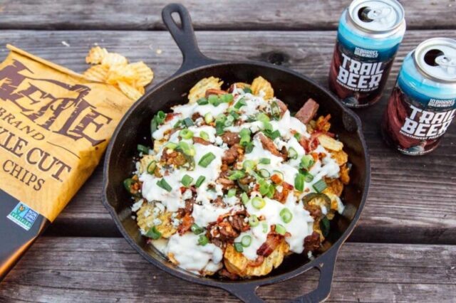 В пабе можно заказать версию этих начос с миксом картофеля фри и чипсов. Для наших нужд картофель фри был не вариантом, потому что, несмотря на все наши путешествия, мы никогда не видели, чтобы кто-то приносил фритюрницу на кемпинг. Но мысль о чипсах вдохновила нас, кто делает хорошие чипсы для кемпинга? Конечно, чипсы Kettle Brand!