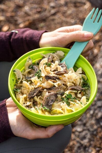 Ассорти из грибов, сытные яичные макароны и богатый кремовый соус из кешью — этот обезвоженный веганский грибной строганоф станет отличным дополнением к вашему следующему походу!