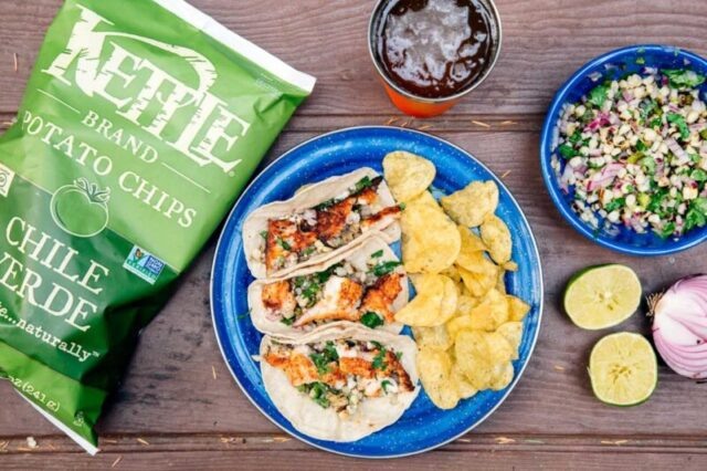 - Соберите ваши тако с подогретыми тортильями, кукурузной сальсой, рыбой и авокадо. Подавайте с чипсами Кеттл и наслаждайтесь!